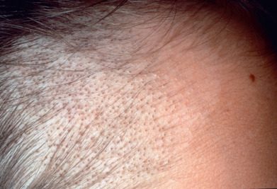 In alopecia areata, the affected patches are bald, the skin is smooth and shiny without signs of inflammation or scaling, and exclamation point hairs can be seen on dermoscopy. Stumps of broken-off hairs are infrequently found, and no fungi are demonstrable. In seborrheic dermatitis, the involved areas are covered by fine, dry, or greasy scales. Hair may be lost, but the hairs are not broken and lymphadenopathy is generally absent. Atopic dermatitis can affect the scalp but is rarely only localized to the scalp. In psoriasis, well-demarcated, sometimes diffuse, areas of erythema and white or silver scaling are noted. Although in children psoriasis may first manifest in the scalp, there is usually some evidence of psoriasis elsewhere. Lichen simplex chronicus is frequently localized to the inferior margin of the occipital scalp. In trichotillomania, as in alopecia areata, inflammation and scaling are absent and the patterns of hair loss are unusual clinically. Serologic testing, scalp biopsies, and immunofluorescent studies may be indicated if the alopecia of secondary syphilis or LE is a serious consideration. It should be noted that adult patients with LE are susceptible to tinea capitis, which may be photosensitive and difficult to distinguish from LE plaques without biopsy and KOH examinations.