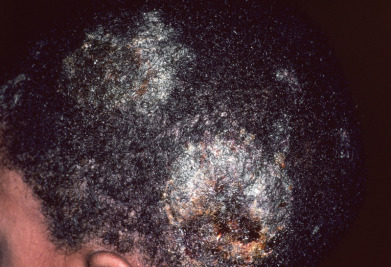 In cases of inflammatory tinea capitis, widespread “id” eruptions may appear concomitantly on the trunk and extremities. These are vesicular, lichenoid, papulosquamous, or pustular and represent a systemic reaction to fungal antigens either during the infection or therapy for the infection. Although the eruptions are usually refractory to topical corticosteroids, they typically clear rapidly after treatment of the fungal infection.
