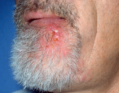 The differential diagnosis includes staphylococcal folliculitis (sycosis vulgaris) and herpetic infections. Tinea barbae differs from sycosis vulgaris by usually sparing the upper lip and by often being unilateral. In sycosis vulgaris, the lesions are pustules and papules, pierced in the center by a hair, which is loose and easily extracted after suppuration has occurred. Herpetic infections usually demonstrate umbilicated vesicles. Tzanck preparations have a low diagnostic yield, but viral culture or direct fluorescent antibody is virtually always positive.