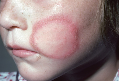 Tinea incognita is a term applied to lesions of tinea that have an atypical appearance due to therapy with topical steroids or calcineurin inhibitors. The lesions are often widespread and may lack an advancing, raised, scaly border. Alternatively multiple edges may be present and there may be a lack of central clearing, rather the center may be eczematous ( Fig. 15.6 ). The diagnosis may be established by KOH examination or biopsy.