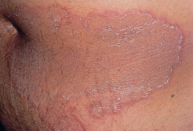 Tinea cruris, also known as “jock itch” and “crotch itch,” occurs more commonly in men on the upper and inner surfaces of the thighs, especially during the summer when the humidity is high. It begins as a small, erythematous, and scaling or vesicular and crusted patch that spreads peripherally and partly clears in the center, so that the patch is characterized chiefly by its curved, well-defined border, particularly on its lower edge. The border may have vesicles, pustules, or papules. It may extend downward on the thighs and backward on the perineum or about the anus. The scrotum is rarely involved.