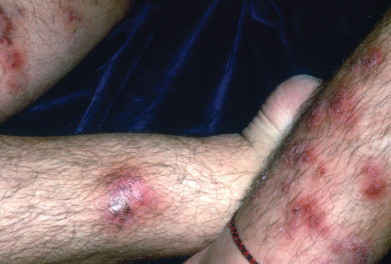 Treatment of tinea with a topical steroid or calcineurin inhibitor can lead to deeper, more inflammatory infections of the hair follicles. It presents as a circumscribed, annular, raised, crusty, and boggy granuloma in which the follicles are distended with viscid purulent material. These occur most frequently on the shins or wrists. The lesions are often seen in areas of occlusion or shaving, or when a topical corticosteroid has been used. In immunosuppressed patients, the lesions may be deep and nodular. Often, patients have been treated with both topical corticosteroids and antifungal agents. If a topical antifungal has been used recently, KOH examination and culture may be negative. A biopsy may be required to establish the diagnosis. Oral therapy is necessary to cure the lesions. Occasionally, a deep, pustular type of tinea circinata resembling a carbuncle or kerion is observed on the glabrous skin ( Fig. 15.7 ). This type of lesion is a fungal folliculitis caused most often by T. rubrum or T. mentagrophytes infecting hairs at the site of involvement.