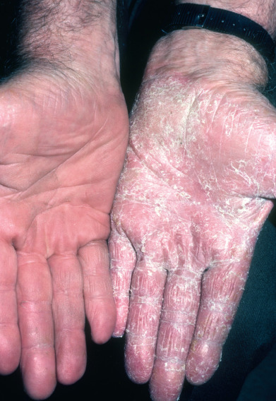 Dermatophytosis of the feet, “athlete’s foot,” is the most common fungal disease. T. rubrum causes the majority of infections although it can be caused by many other dermatophytes, including T. tonsurans. There may be an autosomal dominant predisposition to this form of infection or it may just be being spread within families. T. rubrum typically produces a relatively noninflammatory type of dermatophytosis characterized by a dull erythema and pronounced silvery scaling that may involve the entire sole and sides of the foot, giving a moccasin or sandal appearance. The eruption may also be limited to a small patch adjacent to a fungus-infected toenail or to a patch between or under the toes. In some patients, an extensive patchy, scaly eruption covers most of the trunk, buttocks, and extremities. Rarely, there is a patchy hyperkeratosis.
