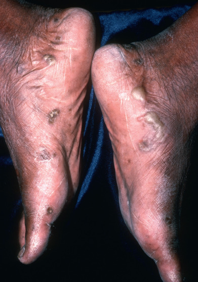 T. mentagrophytes often produces acutely inflammatory multilocular bullae ( Fig. 15.9 ). The burning and itching that accompany the formation of the vesicles may cause great discomfort, which is relieved by opening the tense vesicles. They contain a tenacious, clear, straw-colored fluid. Extensive or acute eruptions on the soles may be incapacitating. The fissures between the toes, as well as the vesicles, may become secondarily infected with pyogenic cocci, which may lead to recurrent attacks of lymphangitis and inguinal adenitis. Gram-negative toe web infections may also supervene. Hyperhidrosis is frequently present in this type of dermatophytosis. The sweat between the toes and on the soles has a high pH, and damp keratin is a good culture medium for the fungi.