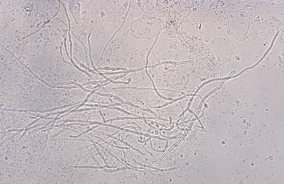 Candida proliferates in both budding and mycelial forms in the stratum corneum or superficial mucosa. Budding yeast and pseudohyphae are easier to detect in histologic section with a PAS stain. Whereas dermatophyte hyphae tend to run parallel to the skin surface, Candida pseudohyphae are more prone to vertical orientation.