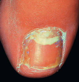 Proximal subungual onychomycosis involves the nail plate mainly from the proximal nailfold, producing a specific clinical picture ( Fig. 15.12 ). It is produced by T. rubrum and Trichophyton megninii and may be an indication of HIV infection.