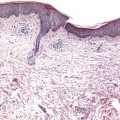 A periodic acid–Schiff (PAS) positive occlusion is noted in the duct in the distal stratum corneum. A faint PAS staining is present in the duct in the granular layer (40×)