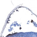 The duct in the lower and middermis is patent; in the proximal stratum corneum, there is a ductal occlusion and the exit is completely occluded. Inflammatory and parakeratotic cells are noted in and around this occlusion (40×)