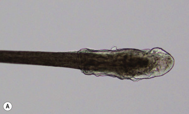 The diagnosis may be confirmed by both counting the number of hairs shed each day and determining the percentage of telogen hairs in the scalp. Telogen hair represents approximately 15% and anagen 85% of scalp hair. If 25% or more of gently pulled hairs are telogen, telogen effluvium can be diagnosed. Anagen hair roots can be recognized by their intact outer and inner hair sheaths, with or without a portion of the dermal papilla adherent to the tip of the root (see Fig. 7-1, A ). Telogen hair roots have uniform shaft diameters, contain no pigment, and are club shaped (see Fig. 7-1, B ), much like the tip of a cotton-tipped applicator.