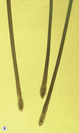 Stages of growth of the hair root. (A) Anagen hairs are the growing hairs that comprise 90% of hair at any time and persist for several years. Anagen hairs are pigmented and have a translucent sheath. (B) Telogen hairs are in a resting phase that persists for 3 months. Note the small bulb and lack of sheath.