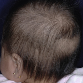 Telogen shedding of the newborn. This 4-month-old girl shows generalized thinning of scalp hair, reflecting telogen effluvium.