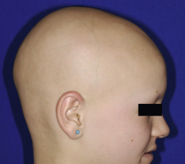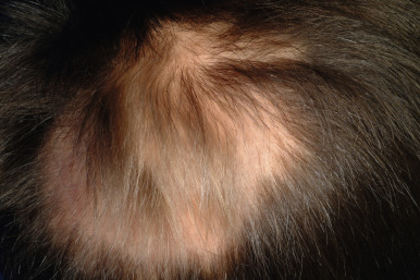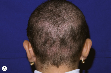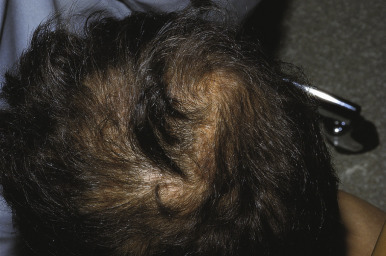 The ophiasis pattern of hair loss begins as a bald spot on the posterior occiput and extends anteriorly and bilaterally in a 1- to 2-inch wide band encircling the posterior scalp, usually extending above the ear but occasionally to the anterior aspect of the scalp ( Fig. 7-35 ). The ophiasis pattern is generally associated with a poor prognosis. Progression to the totalis or universalis forms ( Fig. 7-36 ) occurs more slowly but more often in children than in adults. Alopecia may involve any hair; eyebrows and eyelashes may be lost with or without patches of hair loss on the scalp ( Fig. 7-37 ).