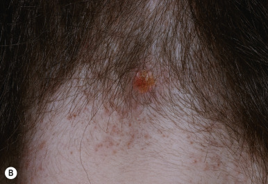 Monilethrix. (A) The hair is dry, lusterless, brittle, and fails to grow to any appreciable length. The occipital area is most commonly and most severely affected in most cases. (B) The follicles are prominent and often hyperkeratotic. This girl was scratching at her occipital area, which led to further breakage and an erosion.
