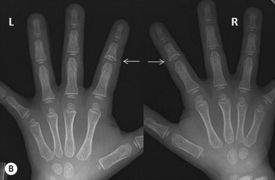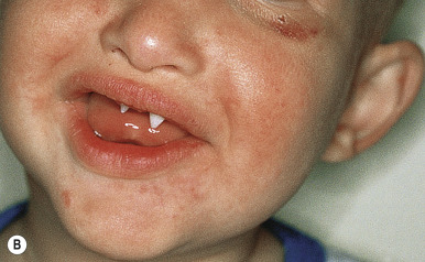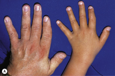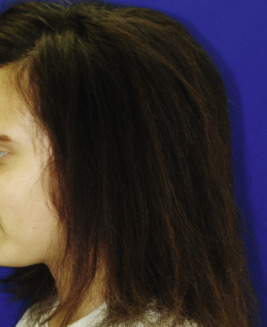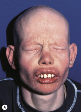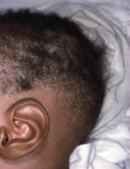 Less commonly trichorrhexis nodosa is genetic and manifests during infancy. Infants with the autosomal dominant form show normal hair at birth, but the hair that regrows within a few months is abnormal; the hair defect tends to improve with advancing age. Trichorrhexis nodosa may also be a manifestation of children with the late-onset form of argininosuccinic aciduria, a condition that results from lack of argininosuccinase. In this condition, the hair is usually normal at birth and first becomes fragile at 1 to 2 years of age with a dull, matted appearance, especially at the occipital area. The hair defects are associated with psychomotor retardation, cerebellar ataxia, and a marked increase of argininosuccinic acid in the blood, urine, and cerebrospinal fluid. Dietary treatment of the metabolic abnormality leads to normalization of the appearance and integrity of the hair. Similar clinical manifestations are found in infants with citrullinemia, caused by a deficiency of argininosuccinic acid synthetase. Trichorrhexis nodosa is the most common hair shaft abnormality, but pili torti has been described and hair bulbs may be atrophic. Some patients show an eruption that resembles acrodermatitis enteropathica. Trichorrhexis nodosa has also been described in oculodentodigital dysplasia (see Group 2 Ectodermal Dysplasia section), trichothiodystrophy (TTD), and trichohepatoenteric syndrome, characterized by facial dysmorphism, liver disease, immune defects, and severe diarrhea requiring intravenous nutrition.