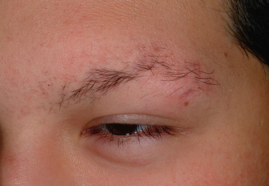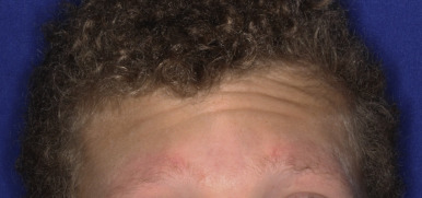 Minoxidil has been shown to stimulate follicular DNA synthesis. Although largely used for AGA, 2% to 5% topical minoxidil solution has been shown to cause cosmetically acceptable hair regrowth in approximately 20% to 45% of patients when used twice daily for 2 months. Best results occur in patients with limited hair loss and when used concurrently with topical corticosteroids or anthralin. Cutaneous side effects may include local irritation, allergic contact dermatitis, and hypertrichosis, especially on the forehead ( Fig. 7-39 ). Although quite rare, three children treated with topical minoxidil developed tachycardia, palpitations, and dizziness. Prostaglandin F2a analogues (e.g., latanoprost, bimatoprost, travoprost) have not been helpful for alopecia of the eyelashes or brows and have been linked to periorbital hyperpigmentation.