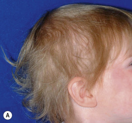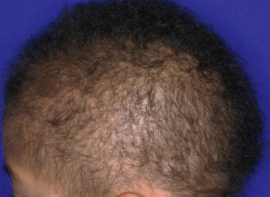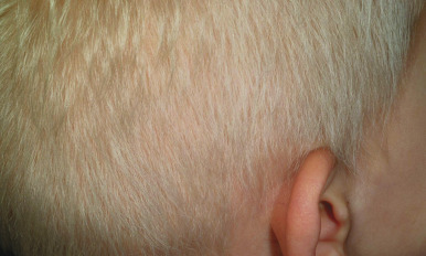 Monilethrix (beaded hair) is an autosomal dominant disorder characterized by partial alopecia from breakage and variation in hair shaft thickness with small node-like deformities that produce a beaded appearance and internodal fragility. The nodal pattern can be seen by trichoscopy but can be subtle. In individuals with this disorder, normal neonatal lanugo hairs are shed during the first few weeks of life. The regrown hair, which generally appears at about the second month of life, is dry, lusterless, and brittle and fails to grow to any appreciable length because of breakage ( Fig. 7-4, A ). In severe cases, the infant may remain bald or the scalp hair may be sparse, easily fractured, and stubble-like with follicular prominence from keratosis. Although generally a disorder of scalp hair, body hairs may also be affected. The clinical findings are limited to the occiput and nape in more limited cases ( Fig. 7-4, B ). Occasionally this disorder is not apparent during infancy but becomes apparent later in childhood or during adult life. Follicular keratosis is associated in some pedigrees and may affect the face, scalp, and extremities. Some patients show koilonychia. Spontaneous improvement or remission may occur at puberty or during pregnancy, suggesting a hormonal influence, but the condition may persist unchanged throughout adulthood. Administration of oral retinoids or 2% minoxidil have been reported to improve the alopecia.