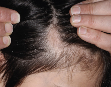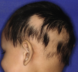 Alopecia areata (AA), one of the most common hair loss disorders with a prevalence of 0.1% to 0.2% of the population, is characterized by the sudden appearance of sharply defined round or oval patches of hair loss. Alopecia totalis (loss of all scalp hair) or alopecia universalis (loss of all body hair) develops in approximately 5% of cases. The cumulative lifetime risk of developing AA is 2.1%, with the peak incidence occurring during young adulthood. Prepubertal onset occurs less often than onset during adolescence but is not uncommon and is associated with a family history of AA and a poorer prognosis. Occurrence in young infants is unusual, and the disorder is very rare in neonates.