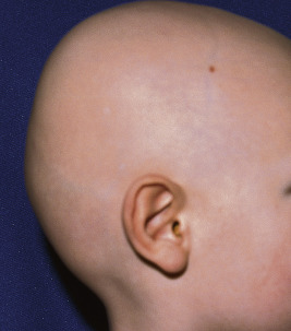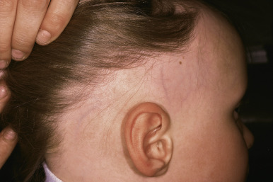 The first crop of terminal scalp hair is in the actively growing anagen phase at birth, but within the first few days of life there is a physiologic conversion to the telogen phase. Consequently a high proportion of neonatal scalp hairs are shed during the first 4 months of life ( Fig. 7-2 ). This telogen shedding (telogen effluvium of the newborn) usually is gradual hair loss, particularly between 2 and 4 months and most noticeable at the occipital area. Rarely the hair loss occurs in the first 4 weeks of life in a frontal-temporal pattern. This physiologic hair shedding at the occipital area is not related to the baby’s sleeping position (i.e., friction). Replacement of the first terminal hairs is generally completed before the first 6 months of life. The neonatal hairline commonly extends along the forehead and temples to the lateral margin of the eyebrows. These terminal hairs gradually convert to vellus hairs during the first year of life. Premature infants are often covered by lanugo hairs, which are more densely distributed on the face, limbs, and trunk. This retention of lanugo hair is probably related to the cyclic activity in utero and the normal shedding of telogen vellus hairs in the fetus during the last few weeks of gestation.