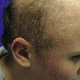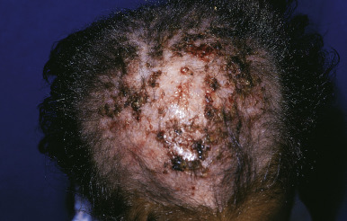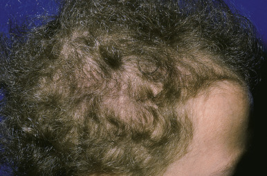 Folliculitis decalvans is characterized by successive crops of patchy, painful folliculitis leading to progressive hair loss and scarring. The disorder must be distinguished by culture from bacterial folliculitis caused by Staphylococcus aureus, although the two forms often coexist, leading to the hypothesis that folliculitis decalvans results from an abnormal host response to staphylococcal toxins. Folliculitis decalvans may begin during adolescence in male patients but is rarely seen in female patients before 30 years of age. Although the scalp is the most commonly affected site, hair-bearing areas of the trunk, axillae, and pubic region may be affected. Typical lesions show round to irregular bald, atrophic patches, each surrounded by crops of follicular pustules. Tufted folliculitis is a variant in which tufts of hair emerge from dilated follicular openings amid areas of scarring.