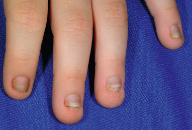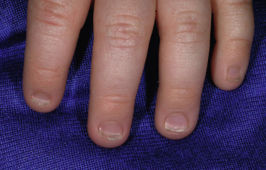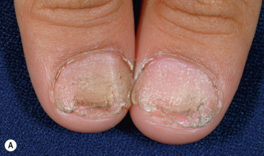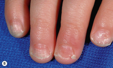 Nail defects are seen in 10% to 20% of cases. Although more extensive disease is associated with more nail involvement, some patients may have extensive nail dystrophy with little hair change. The most characteristic nail abnormality is a fine, grid-like stippling, regularly arranged in horizontal and/or vertical rows with smaller and shallower pits than those seen in patients with psoriasis ( Fig. 7-38, A ). Proximal shedding (onychomadesis), opacification, and serration of the free edges may also be seen ( Fig. 7-38, B ). Longitudinal ridging (trachyonychia) is another associated finding. Nail dystrophy tends to occur more often and be more severe in patients with alopecia totalis and universalis.