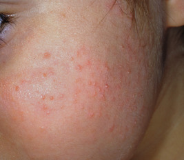 Pseudofolliculitis barbae, commonly called razor bumps or ingrown hair, is an inflammatory condition of hair follicles of the beard area that is particularly common in adolescent males of African ancestry with curly, coarse hair (see Chapter 14 ). The condition can affect adolescent girls with tightly curled hair, however, especially if shaving occurs on the face because of hirsutism or because of hair removal elsewhere (waxing plucking or shaving of the axillae or pubic area). Erythematous, 2- to 4-mm, flesh-colored or often hyperpigmented, follicular-based papules are characteristic. The shape of the hair follicle, hair cuticle, and direction of hair growth predispose the patient to the inflammatory response when hair is shaved or plucked. A single-nucleotide polymorphism (SNP) in KRT75, encoding hair keratin 75, has been linked with a much greater tendency to develop pseudofolliculitis barbae, especially in individuals with curly hair. It is theorized that the pressure and traction exerted by close and regular shaving destabilizes the hair keratin.