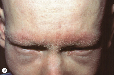 Netherton syndrome. (A) The characteristic microscopic features of Netherton hair (trichorrhexis invaginata) are often found in eyebrow hairs. Note the sparse, broken brows and lashes in this young girl who also shows the periorbital dermatitis. (B) Short, broken hair throughout the scalp. Note the desquamative scaling and excoriations.