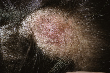 Alopecia mucinosa. An erythematous, mildly scaling, infiltrated hairless plaque. Biopsy shows mucin in the follicular area. Alopecia mucinosa tends to be a benign condition in children but has been associated with cutaneous T-cell lymphoma in adults.