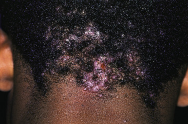 Acne keloidalis (folliculitis keloidalis) is a chronic scarring folliculitis and perifolliculitis of the nape and occipital scalp. Initial lesions tend to be inflammatory papules and occasionally pustules that evolve into firm keloidal, often coalescent papules and plaques ( Fig. 7-30 ). Severe cases may show abscesses and sinus formation. Patients may complain of pruritus and discomfort. The disorder is seen most commonly in postpubertal males, especially African-Americans between the ages of 14 and 25 years, but is occasionally described in females.