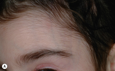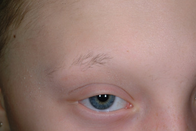Although trichorrhexis invaginata may occur as an isolated finding, this hair shaft abnormality is characteristic of Netherton syndrome ( Fig. 7-5 ), an autosomal recessive genodermatosis that has been linked to mutations in SPINK5 (see Chapter 5 ). Neonates with this disorder characteristically show generalized exfoliative erythroderma and failure to thrive, often associated with hypernatremic dehydration, recurrent infections, and sepsis. Severely affected neonates may show extremely sparse and even absent hair, making the diagnosis based on hair shaft examination difficult. However, the eyebrows are almost always short and broken (see Fig. 7-5, A ); eyebrow hairs should be examined in cases in which the abnormality cannot be demonstrated from scalp hair, and trichoscopy (dermoscopy) can be helpful.