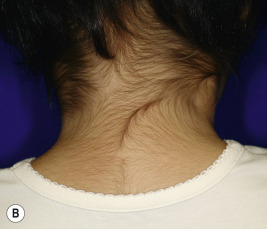 Hypertrichosis induced from topical medications. Children who apply both topical corticosteroids and minoxidil are at particularly high risk for developing localized hypertrichosis, especially on the forehead (A) and nape (B) .