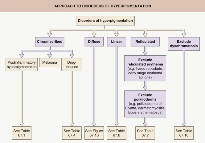 To aid in the clinical approach, disorders of hyperpigmentation can be divided into diffuse, circumscribed, linear, and reticulated subsets ( Fig. 67.1 ). A discussion of each of these categories is followed by an overview of dyschromatoses, disorders characterized by both hypo- and hyperpigmentation. Benign melanocytic neoplasms are covered in Chapter 112 .