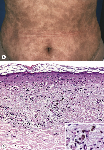 A Multiple gray–brown macules and patches on the abdomen; note the coalescence of lesions. The “ashy” color is characteristic. B Histopathologic features include vacuolar degeneration of the basal layer, a sparse perivascular lymphocytic infiltrate, and prominent dermal melanophages (see inset).