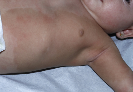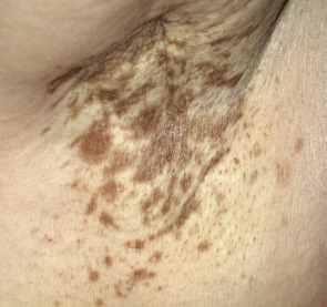 Multiple coalescing brown to gray–brown macules in the axilla of a middle-aged woman.