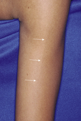 In all races the dorsal and extensor surfaces are relatively hyperpigmented, and the ventral surfaces are less pigmented. This is most evident in races with darker skin (African-Americans, Hispanics, and Asians). The separation of the dorsal and ventral pigmentation is most conspicuous on the extremities (Voigt–Futcher lines) ( Fig. 11-1 ). This differentiation of dorsal and ventral pigmentation is present from infancy and persists throughout adulthood. Approximately 75% of African-Americans and 10% of whites have at least one line of pigmentary demarcation.