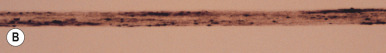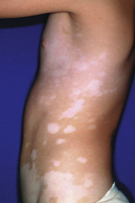 The location, size, and shape of individual lesions vary considerably, yet the overall picture is characteristic. Lesions usually appear as partially or completely depigmented ivory-white macules or patches, usually with well-defined, sometimes hyperpigmented, convex bor­ders ( Figs. 11-2 through 11-7 ). They tend to have an oval or linear contour and range in size from several millimeters to large patches. Rarely, extensive or near-total depigmentation of the body (universal or total vitiligo) occurs (see Fig. 11-4 ). Although usually considered to be a bilateral disorder, vitiligo may be asymmetric; segmental vitiligo, in which the depigmentation is confined to a localized, usually unilateral area, occurs more often in children than in adults (see Fig. 11-5 ). In 75% of affected individuals the first lesions occur as depigmented spots on exposed areas such as the dorsal surfaces of the hands, face, and neck. Other sites of predilection include the body folds (the axillae and groin), body orifices (the eyes, nostrils, mouth, navel, areolae, genitalia, and perianal regions (see Figs. 11-6 and 11-7 ), and areas over bony prominences such as the elbows, knees, knuckles, and shins (see Fig. 11-3 ). Approximately 12% of patients show white hairs (leukotrichia or poliosis) ( Fig. 11-8 ). Vitiligo has been divided into several subtypes based on the distribution of lesions. In descending order of incidence in pediatric patients, these include generalized, focal, segmental, acrofacial, mucosal, and universal. Patients with vitiligo, especially those with prepubertal onset, commonly show halo nevi, pigmented nevi surrounded by a zone of depigmentation ( Fig. 11-9 ) (see Chapter 9 , Fig. 9-26 ). The discovery of a halo nevus and particularly multiple halo nevi should prompt the search for vitiligo elsewhere.