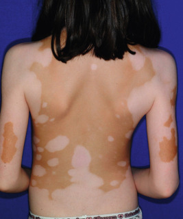 Vitiligo. Extensive depigmentation in this 13-year-old girl. Virtually all of her skin was depigmented, except for the pigmented areas on the back. After years of unsuccessfully trying to stimulate repigmentation, at 16 years of age this girl and her parents elected to initiate 20% monobenzyl ether of hydroquinone.