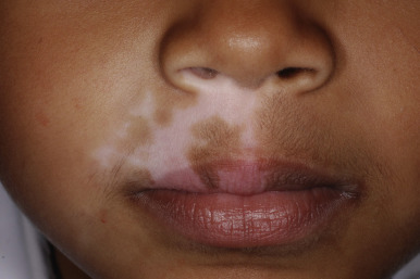 Segmental vitiligo. Segmental distribution of depigmentation on the right side of the philtrum and upper lip. Note the sharp midline demarcation.