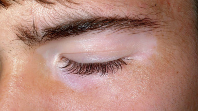 Vitiligo. Periorbital depigmentation. Although eyebrows and eyelashes are occasionally affected as well (poliosis), in this boy the hair has retained its pigmentation. The perioral and perinasal areas are also commonly affected on the face.
