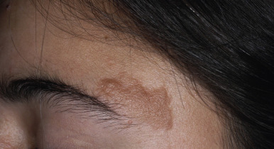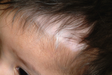 Tuberous sclerosis. The fibrous cephalic plaque may be present at birth and, together with the hypopigmented macules, may allow a definitive diagnosis of tuberous sclerosis.