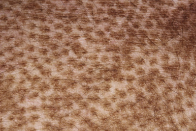 Idiopathic guttate hypomelanosis is a common disorder of adults, and its incidence increases with increasing age. It occasionally occurs in children and is more common in female individuals, although the latter may represent reporting bias. More striking in individuals with darker pigmentation, the lesions of idiopathic guttate hypomelanosis are characteristically 0.5- to 6-mm sharply defined, porcelain white macules. They are asymptomatic and once present do not tend to change. The macules most commonly occur on the extensor forearms and on the shins. The diagnosis is usually made clinically, and no treatment is effective. The underlying cause is unknown, although sun exposure is thought to be a trigger.