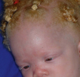Individuals with OCA1A are unable to produce melanin at all and show white skin, white hair, and blue irides regardless of familial skin coloration. Hair may show a slight yellow tint with advanc­ing age because of denaturation of hair keratins. Similarly, ocular abnormalities are most severe with OCA1A. Eye findings include photophobia (with squinting), nystagmus (which typically develops at 6 to 8 weeks of age), strabismus, and decreased visual acuity; patients with OCA1A are often legally blind. The optic fibers are misrouted, resulting in monocular vision, which is usually not altered by surgical correction of the nystagmus or strabismus. Although neurologic development is otherwise generally normal, an increased risk of attention-deficit/hyperactivity disorder (ADHD) has also been described. Actinic damage (cutaneous atrophy, telangiectasia and wrinkling, actinic cheilitis, actinic keratoses) and malignant skin tumors (especially squamous cell carcinoma and nodular basal cell carcinoma but also melanoma) are almost always seen in affected young adults but may present during childhood if the skin and eyes are not protected.