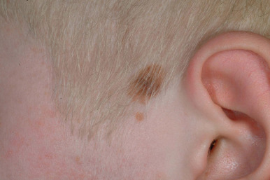Three or more hypopigmented macules (white spots) of TSC are seen in 97% of patients at birth or shortly thereafter, although the appearance of additional lesions as late as 6 years of age has been described. Once present, the hypopigmented macules tend to be persistent and stable in shape and relative size but may become less apparent during adulthood. Wood lamp examination in a completely darkened room may be useful in accentuating the macules in fair-skinned children. The white spots most commonly occur on the trunk, but hypopigmented tufts of scalp or eyelash hair meet the criterion for a hypopigmented macule. They range in size from a millimeter to several centimeters and number from a few to more than 75; 18% to 20% of individuals with TSC have 1 or 2 hypopigmented macules. The hypopigmented macules ( Fig. 11-21 ) are often round (“thumbprint”), confetti-like hypopigmented macules (particularly over the pretibial areas), and oval or linear, but a lance-ovate shape (“ash leaf spots”) is commonly described and is unusual in other disorders of localized decreased skin pigmentation such as nevus depigmentosus and vitiligo. Lesions of vitiligo tend to be depigmented and show a bright white coloration with Wood lamp examination. The hypopigmented white spots of TSC are most difficult to distinguish from nevus depigmentosus (also called nevus achromicus; Fig. 11-22 ), which occurs in 1.6% to 4.7% of children, suggesting that the majority of young children with a white spot do not have TSC. Nevus depigmentosus may be present at birth or appear during early infancy as normal pigmentation increases and then persist. Despite its name, most nevus depigmentosus lesions are hypopigmented, not depigmented. Most individuals will have a solitary lesion of nevus depigmentosus, but multiple lesions and segmental forms of nevus depigmentosus have been described. Nevus depigmentosus and the hypomelanotic macules of TSC must also be distinguished from nevus anemicus, a developmental anomaly characterized by a circumscribed round or oval patch of pale or mottled skin (see Chapter 12 , Fig. 12-60 ).