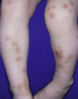 Hermansky–Pudlak syndrome. The legs of this baby show both the pigmentary abnormality and extensive ecchymoses as a sign of the bleeding diathesis.