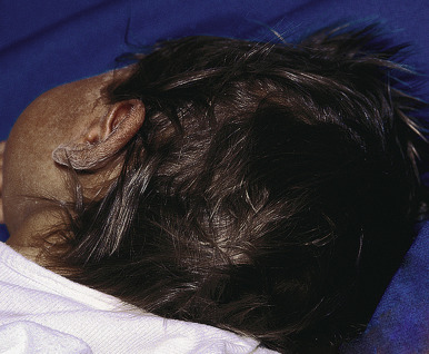 Patients with Chédiak–Higashi syndrome (CHS) usually have a characteristic silvery sheen to the hair and skin, with a skin color that may appear lighter than that of other family members. In affected individuals of family backgrounds of darker skin, however, the skin of acral, sun-exposed areas (ears, nose) may become intensely hyperpigmented ( Fig. 11-14 ) or show only speckled hypopigmentation. Decreased iris pigmentation results in an increased red reflex and photophobia. Strabismus and nystagmus are common, but visual acuity is usually normal. Inflammation and ulceration of the oral mucosa, especially of the gingivae, have been described.