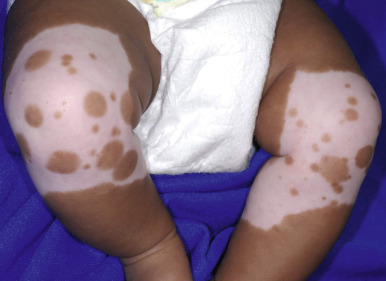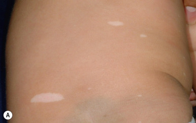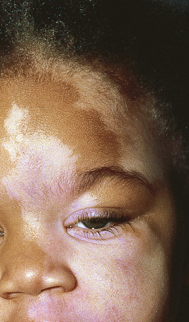 The presence of a white forelock and the pattern of depigmentation suggest a diagnosis of piebaldism or WS (see Figs. 11-17 and 11-19 ). Most individuals with WS show characteristic facial features. The diagnosis of albinism (see Oculocutaneous Albinism section) may be established by its presence at birth and by the facts that normal eye color is retained in vitiligo (but not in albinism); in addition, hair on glabrous skin in the patient with vitiligo, in contrast to that in the patient with albinism, often retains most of its pigment (see Fig. 11-11 ). Adolescents with GM3 synthase deficiency progressively develop depigmented patches as well as acral lentigines. The hy­­popigmented macules of tuberous sclerosis (see Fig. 11-21, A ) usually lack the characteristic milk-white appearance of lesions of vitiligo, are present at birth or during the first years of life, do not change with age, and have a normal number of melanocytes (with reduction in size of melanosomes and melanin granules within them) in contrast to the absence or decrease in number of melanocytes in patients with vitiligo.