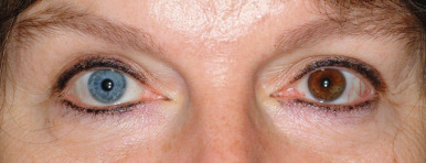Waardenburg syndrome, type II. This affected individual shows iris heterochromia with the brilliant blue iris. She had sensorineural deafness but none of the facial features seen in type I Waardenburg syndrome.