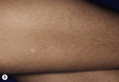 Tuberous sclerosis. (A) Several lance-ovate (“ash-leaf”) and “thumbprint” white macules are noted on this infant’s back. (B) Confetti-like macules on the lower extremities in a 13-year-old boy.