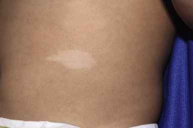 Vitiligo. Depigmented, usually well-defined, white mac­ules or patches that tend to have an oval or linear contour.