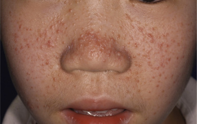 Tuberous sclerosis. Facial angiofibromas (adenoma sebaceum) are typically 1- to 4-mm, skin-colored to red, dome-shaped papules with a smooth surface. The facial angiofibromas largely involve the cheeks and nose with relative sparing of the upper lip.