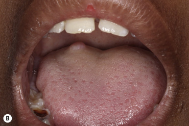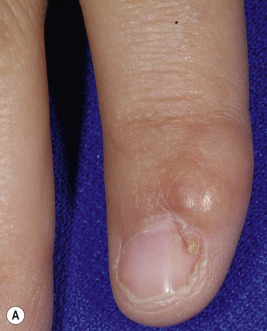 Tuberous sclerosis. (A) Ungual fibromas on the fourth finger of this adolescent boy. (B) Intraoral fibroma.